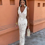 Un abito aderente senza maniche, con spalline larghe e scollo a V che valorizza il décolleté. Il motivo in maglia all’uncinetto crea una texture raffinata e originale.
